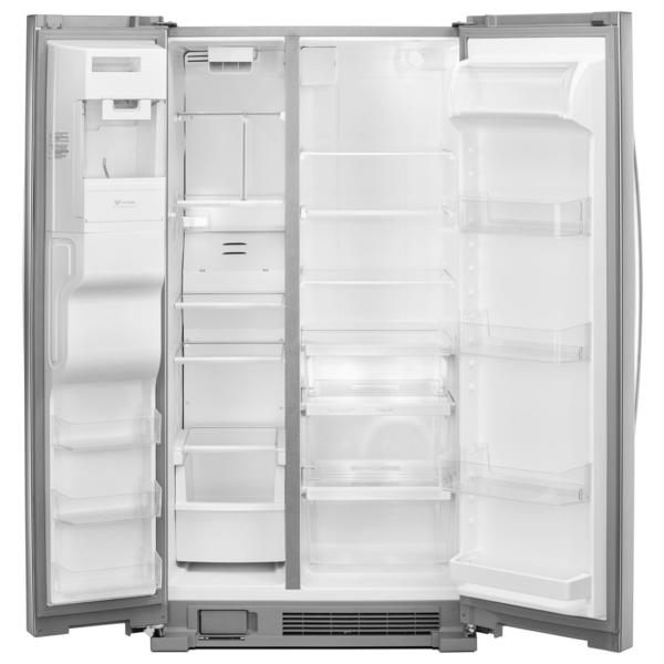 A large side freezer includes a water and ice dispenser and enough room for all your frozen foods.